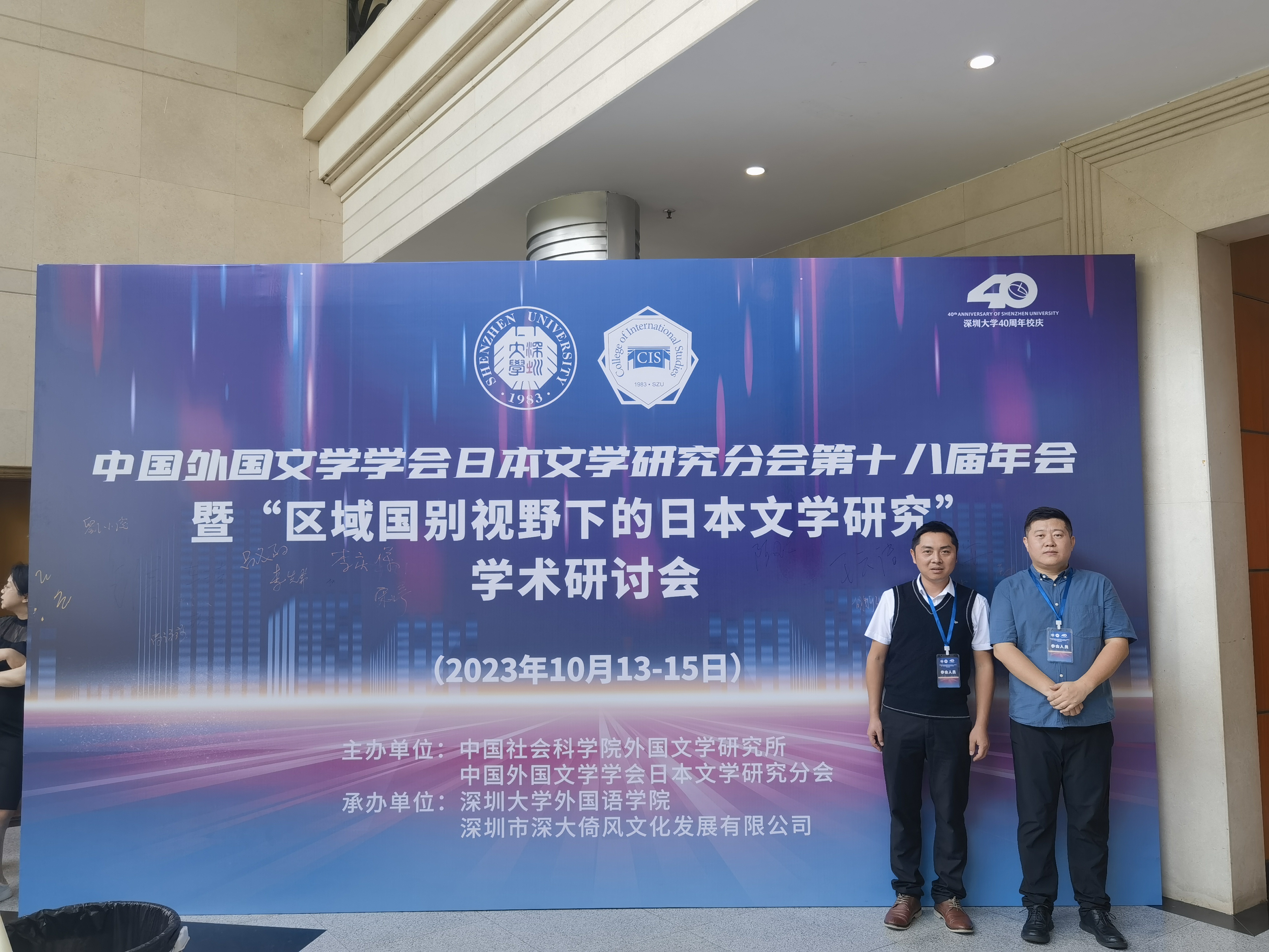 2023年10月13-15日,第十八届中国外国文学学会日本文学研究分会年会暨“区域国别视野下的日本文学研究”学术研讨会在深圳大学举行。本届年会暨学术研讨会由中国社会科公司外国文学研究所、中国外国文学学会日本文学研究分会主办,由深圳大学tyc522cc太阳成集团等单位承办,tyc522cc太阳成集团丁跃斌副经理及潘贵民博士参加了此次年会暨学术研讨会。