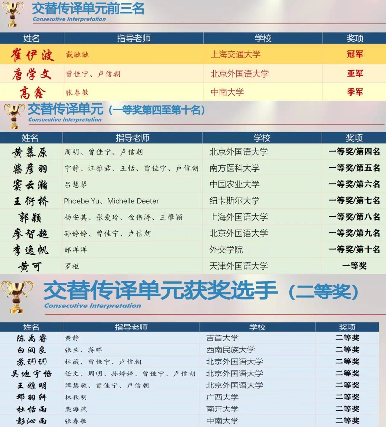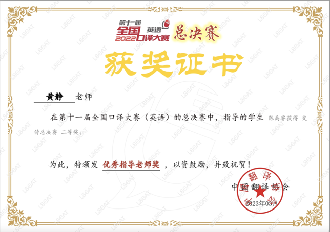 本网讯(通讯员 黄静 修伟)4月7日,第十一届全国口译大赛(英语)总决赛获奖名单公布,公司2021级翻译硕士(MTI)研究生陈禹睿喜获全国总决赛交替传译组二等奖,排名第十二位,获得目前公司在该项赛事的最好成绩,指导老师黄静获优秀指导老师奖。