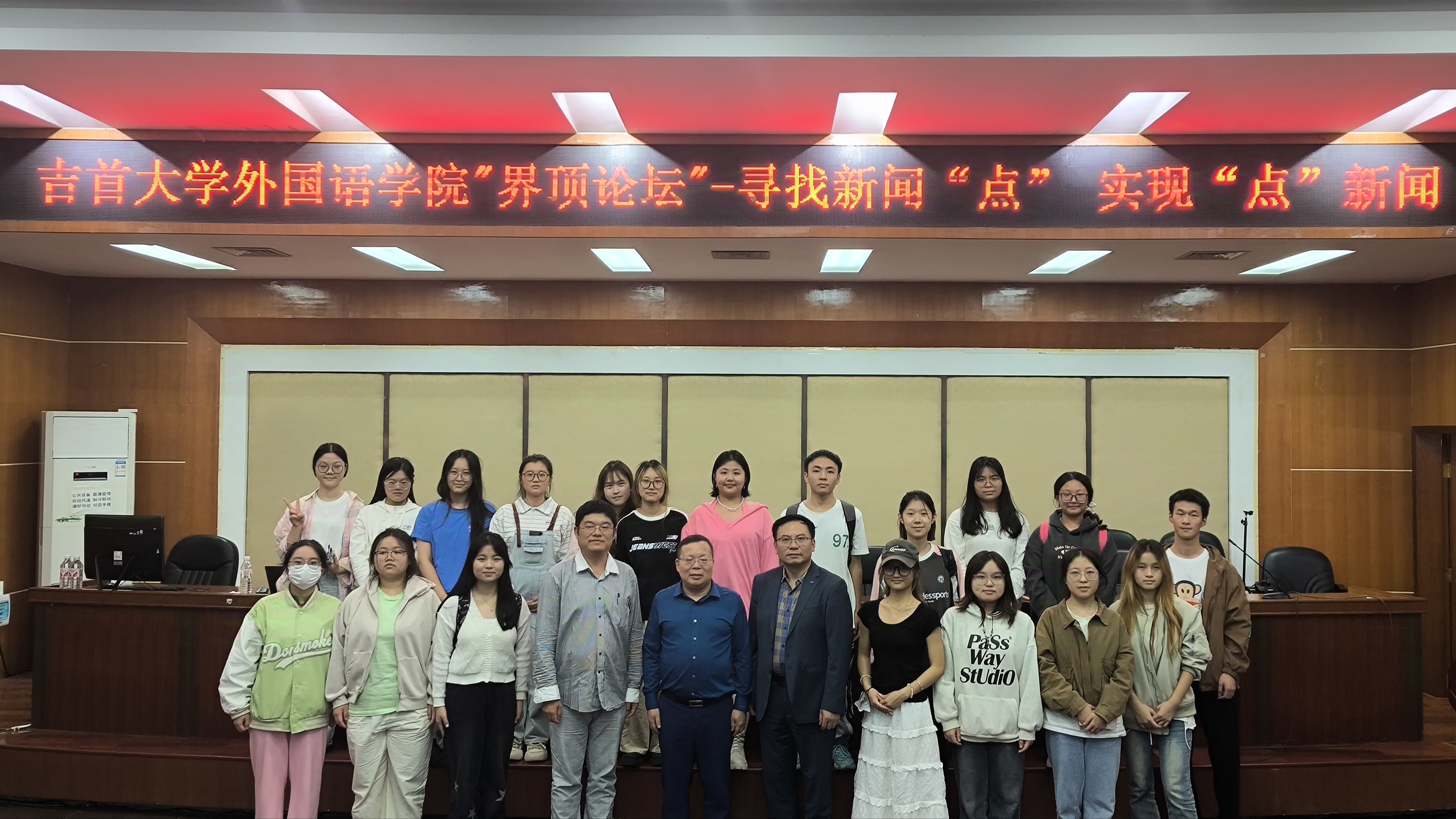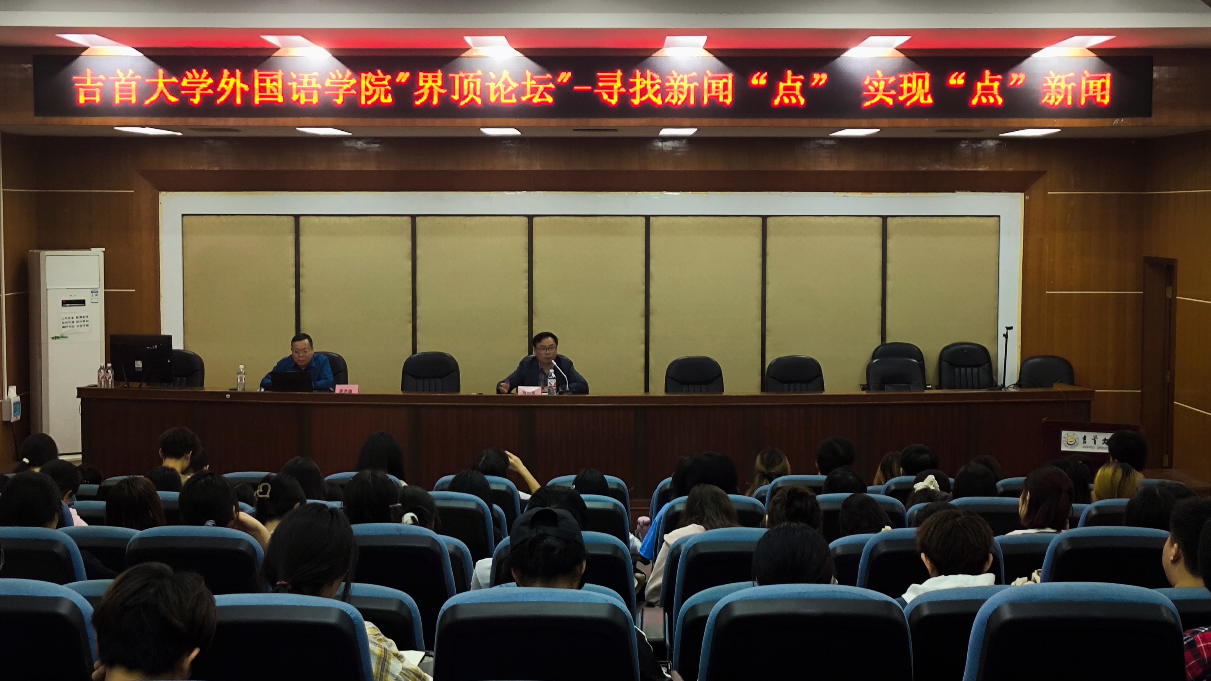 本网讯(修伟 陈慧 李安妮 赵艺)10月9日晚19:00应外国语公司党委邀请,公司党委宣传部常务副部长李洪雄研究员做客“界顶论坛”在张家界校区逸夫教学楼多功能报告厅为校区师生作题为《寻找新闻“点” 实现“点”新闻》新闻写作报告,报告由外国语公司党委书记简功友主持,张家界校区tyc522cc太阳成集团师生及校区新闻写作爱好者100余人出席。