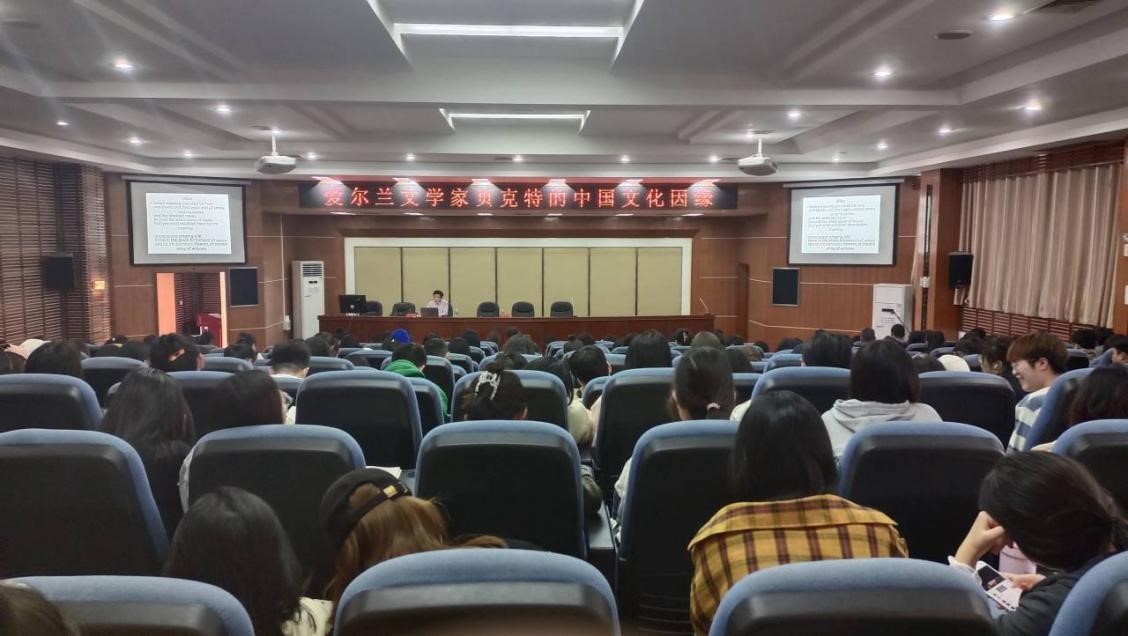 本网讯(通讯员 游馨 姜晓鸥 段沁熊)2023年10月8日,上海外国语大学文学研究院副经理、博士生导师张和龙教授莅临“界顶论坛”,于公司逸夫楼多功能报告厅举行“爱尔兰文学家贝克特的中国文化因缘”学术讲座。本次讲座由tyc522cc太阳成集团副经理丁跃斌教授主持。